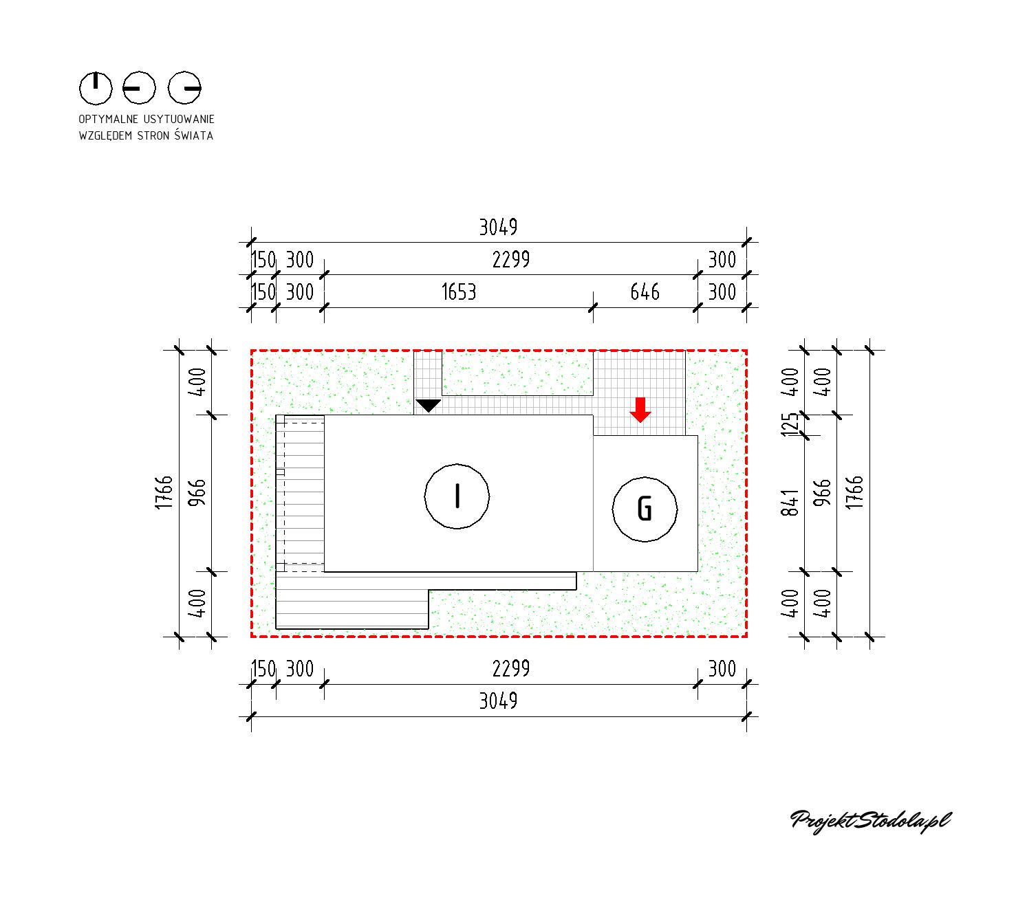Wjazd do Projektu Stodoła Optimum po zmianach 1 usytuowano od północy. Minimalne wymiary działki 30,49 x 17,66 m*