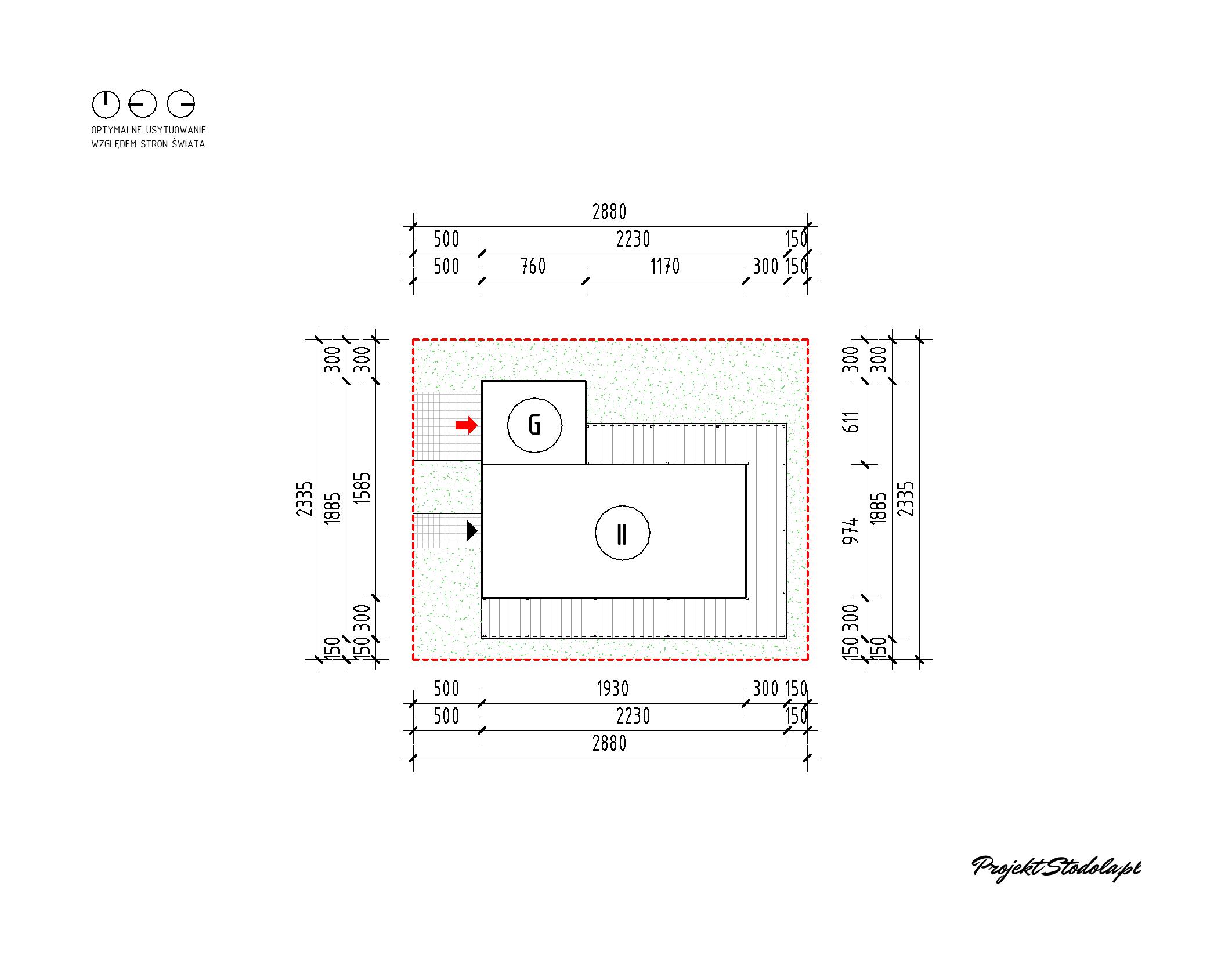 Wjazd do Projektu Stodoła Modern Farmhouse lustrzane odbicie po zmianach 1 usytuowano od strony zachodniej. Jednocześnie minimalne wymiary działki to 28,80 x 23,35 m*