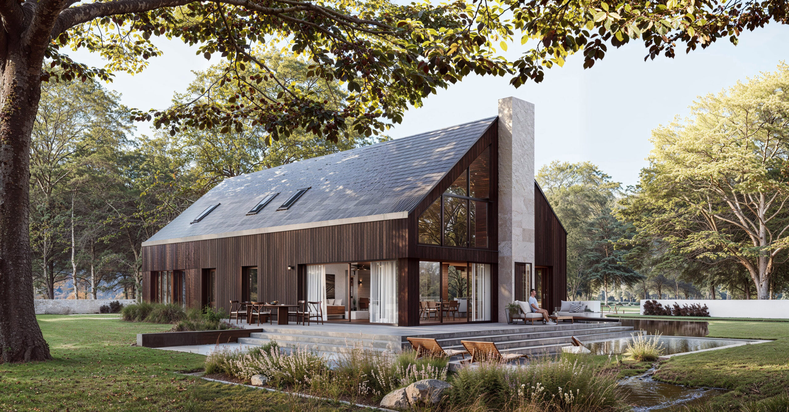 Dom z poddaszem nowoczesna stodoła, rzut na planie litery L, przykryty dwuspadowym, symetrycznym dachem, o kącie nachylenia 40° (kalenica prostopadła do drogi dojazdowej). Budynek zaprojektowany w nowoczesnym stylu. Wyeliminowano akcenty w formie zadaszeń, okapów, lukarn, by budynek był uniwersalny, ale przede wszystkim nie generował dodatkowych kosztów podczas budowy.