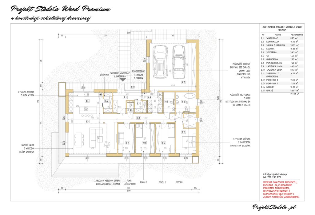Projekt Stodoła Wood Premium to nowoczesny dom szkieletowy drewniany, zaprojektowany jako budynek parterowy z możliwością adaptacji poddasza. Projekt łączy sprawdzony układ funkcjonalny wersji S+ Premium z zaletami technologii lekkiej konstrukcji drewnianej.