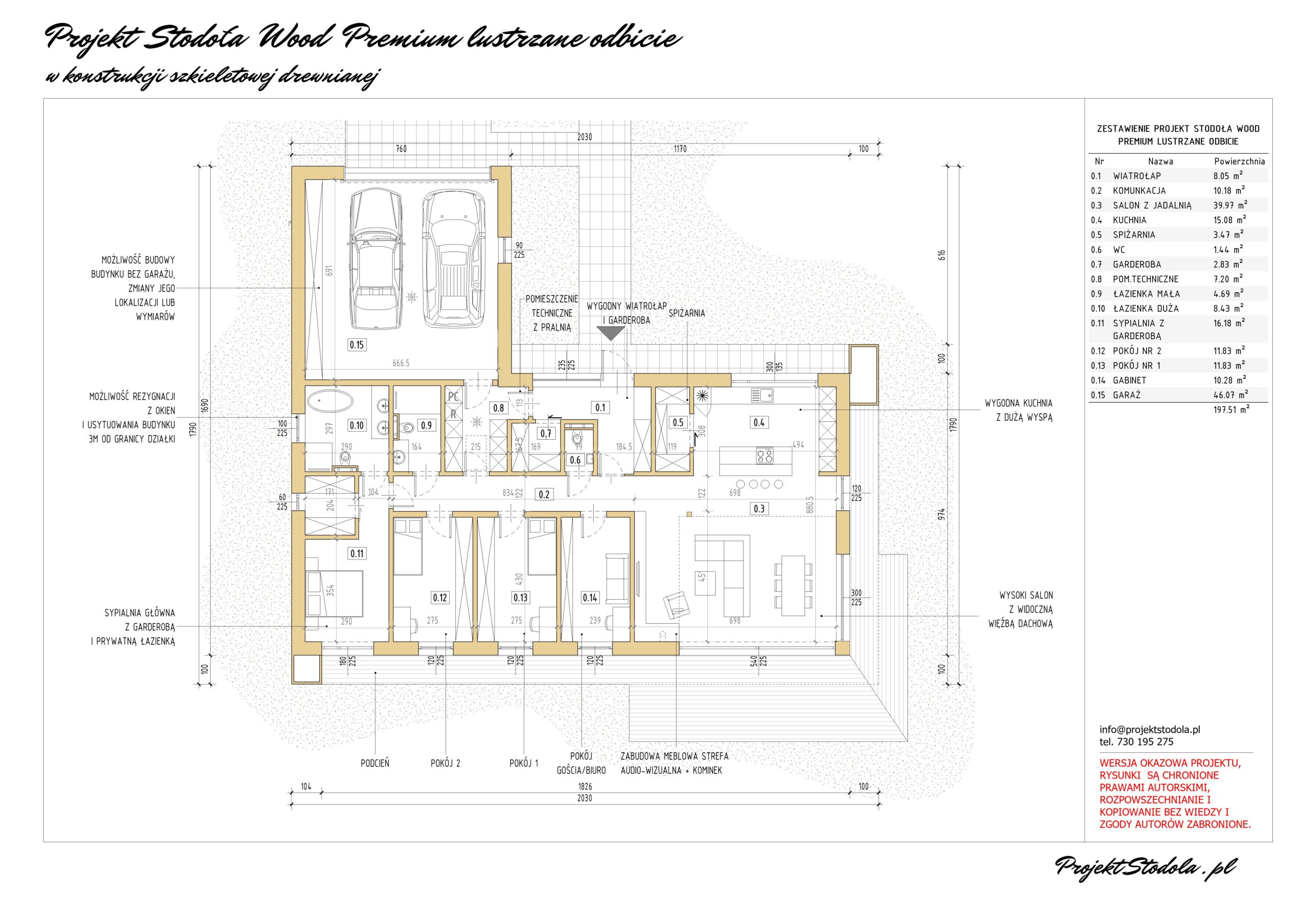 Projekt Stodoła Wood Premium to nowoczesny dom szkieletowy drewniany, zaprojektowany jako budynek parterowy z możliwością adaptacji poddasza. Projekt łączy sprawdzony układ funkcjonalny wersji S+ Premium z zaletami technologii lekkiej konstrukcji drewnianej.