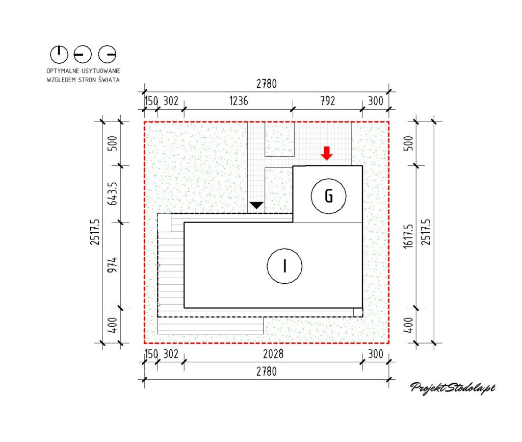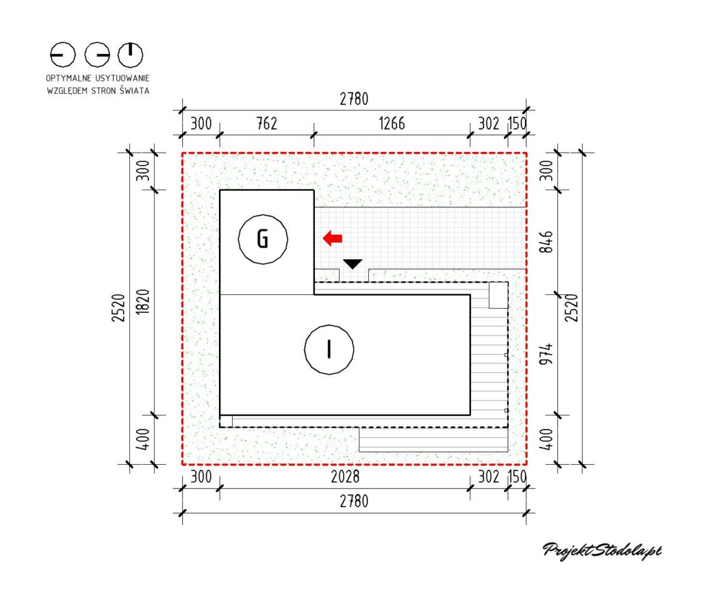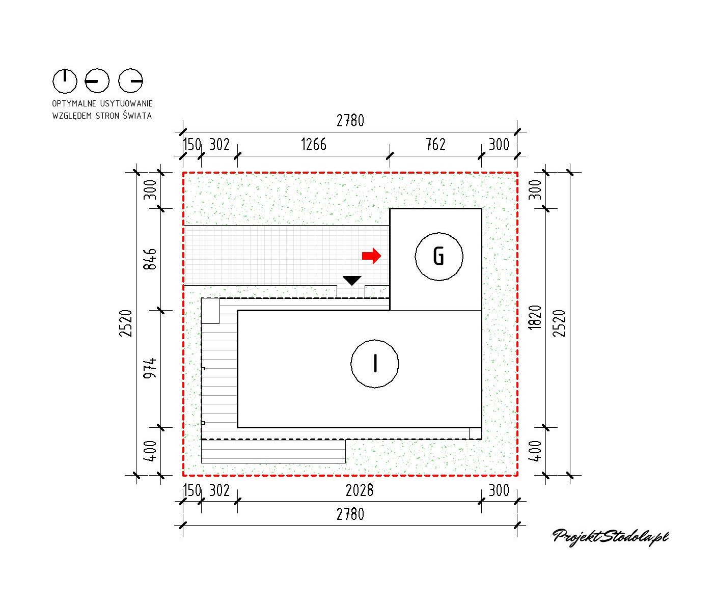 - Wariant 2 (modyfikacja na etapie adaptacji) – Wjazd od boku budynku. Minimalne wymiary działki 27,80 x 25,20 m
