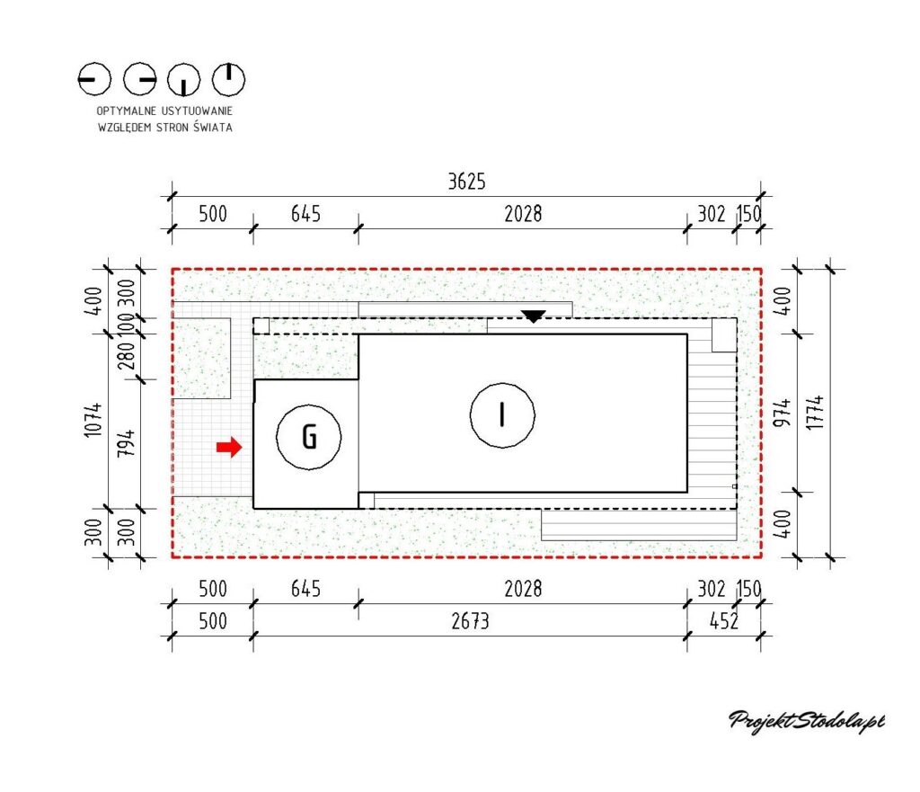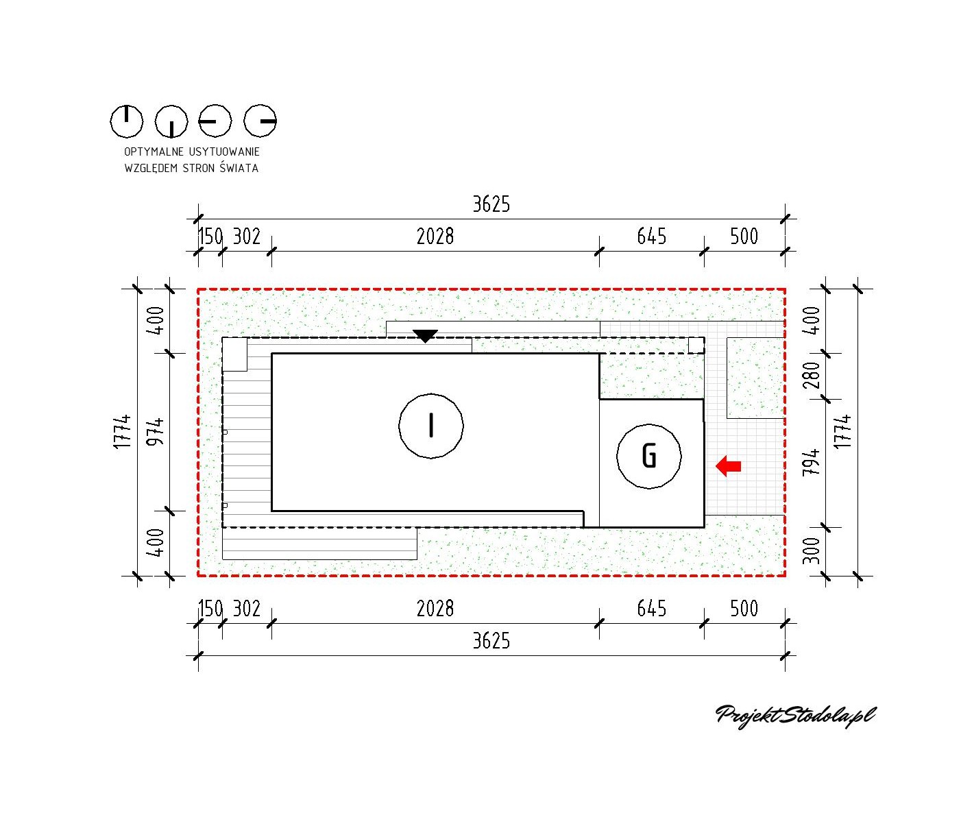 Budynek można usytuować w kilku wariantach. W podstawowym przy wjeździe od preferowanej strony północnej (Wariant 1) oraz przy wjeździe od strony wschodniej (Wariant 2) lub w Wariancie 3- na długie i wąskie działki- podobnie jak w projekcie Stodoła S+ Long.