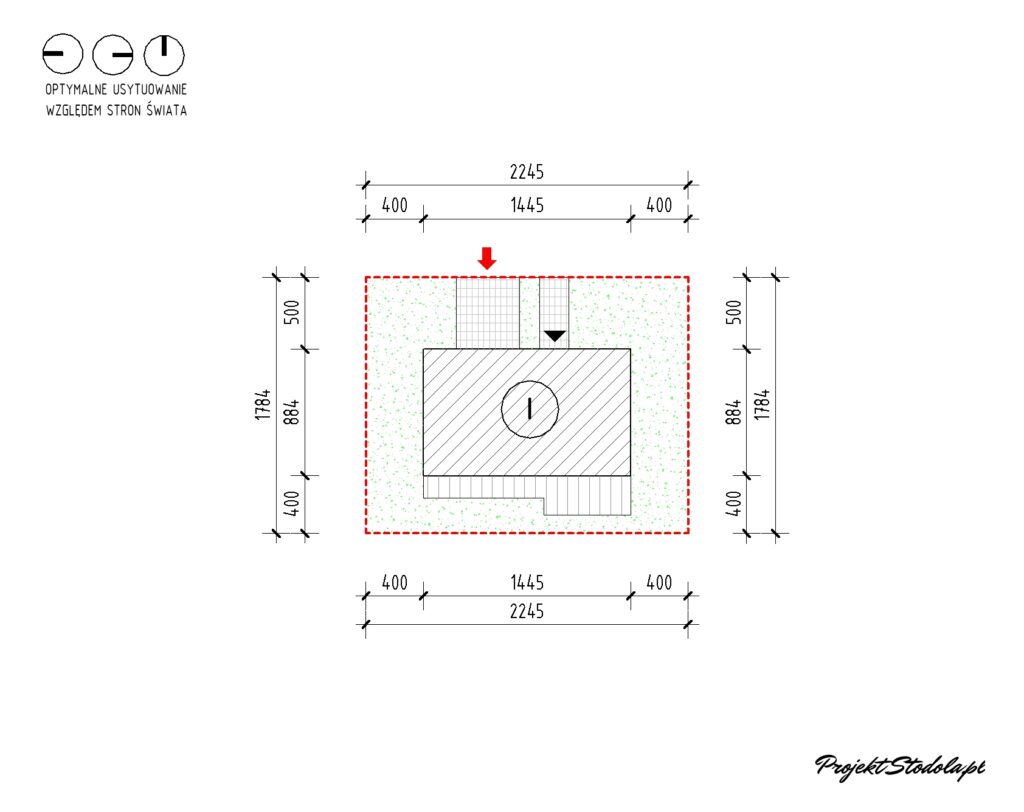 - Wariant 1 – wjazd od frontu. Minimalne wymiary działki: 22,45 x 17,84 cm