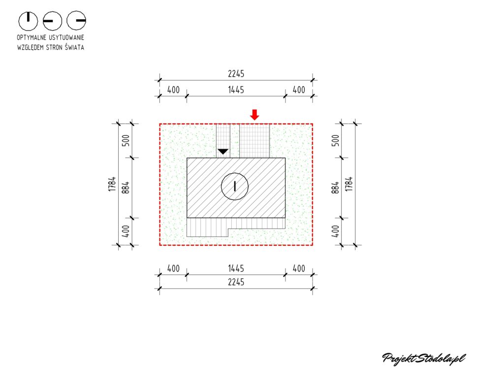 Najlepszym usytuowaniem jest wjazd od strony północnej działki, ale bardzo dobrze sprawdzi się również wjazd od strony wschodniej i zachodniej. Do budynku można dodać garaż od frontu (po delikatnej korekcie układu okien) lub od strony bocznej. Poniżej przedstawiamy różne warianty usytuowania na działce budynku.