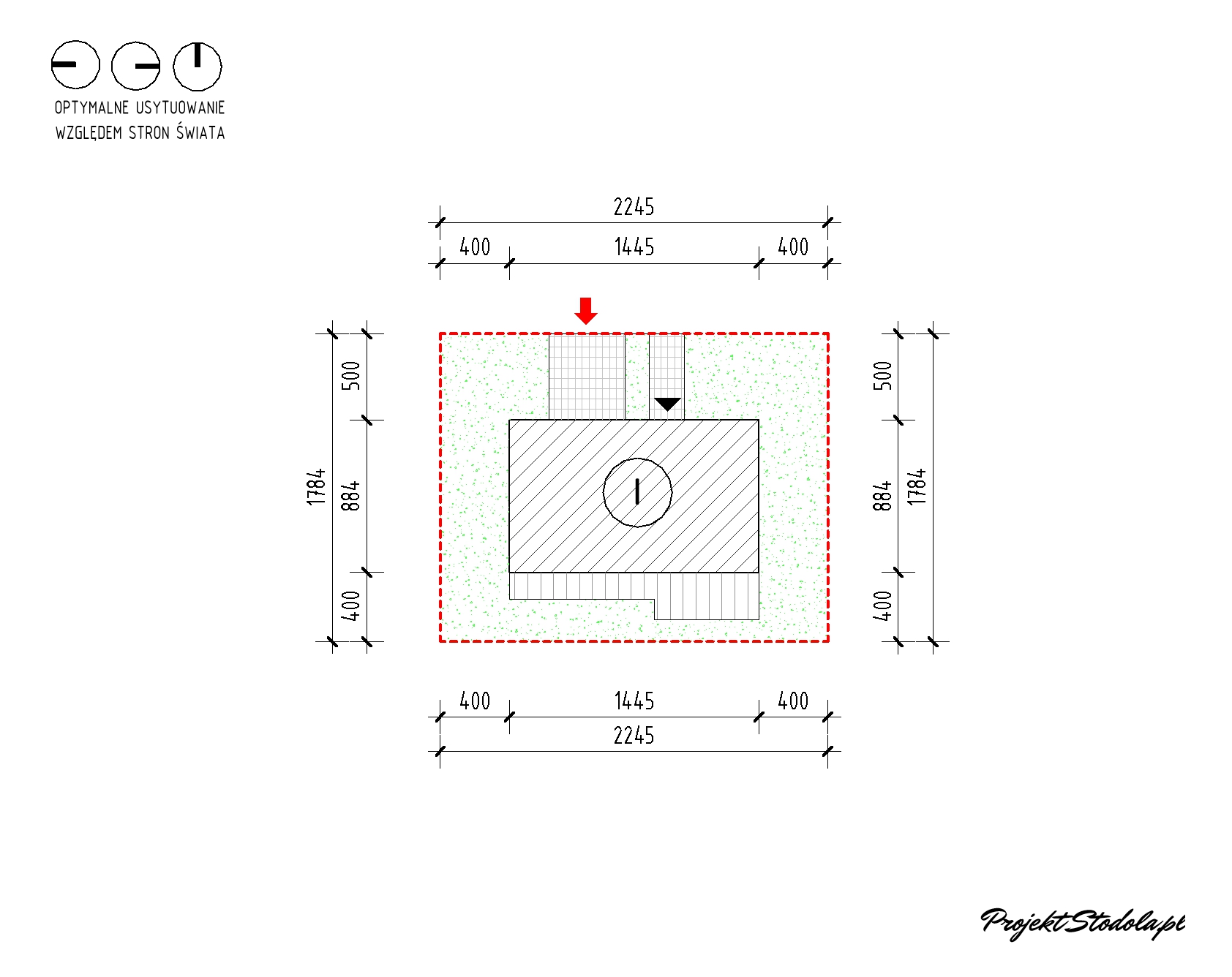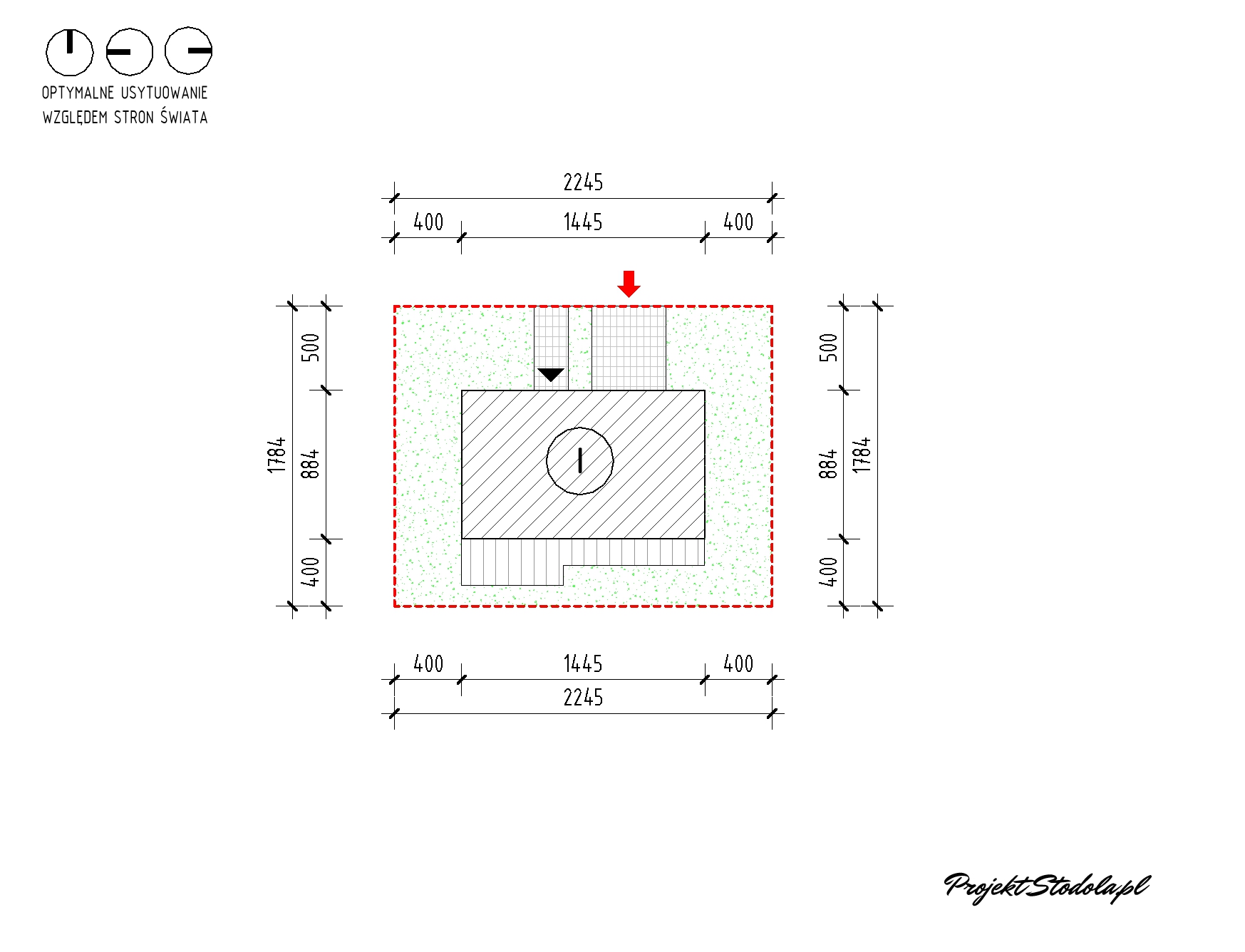 - Wariant 1 – wjazd od frontu. Minimalne wymiary działki: 22,45 x 17,84 cm