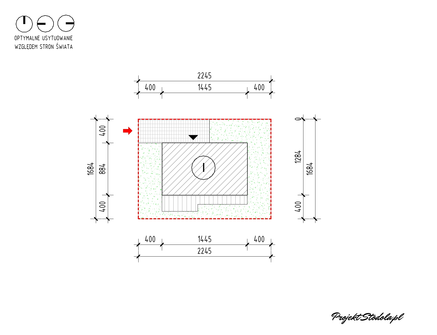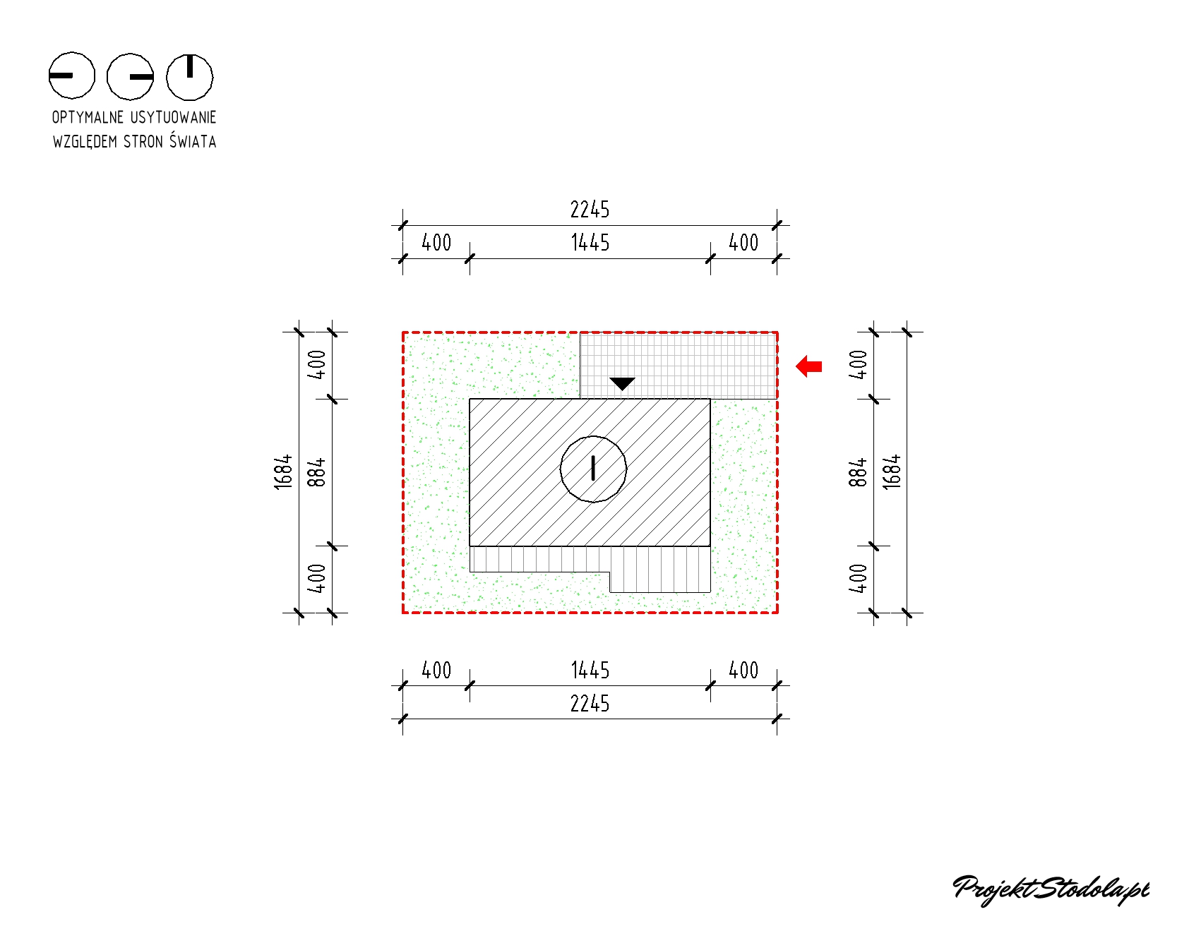 Najlepszym usytuowaniem jest wjazd od strony północnej działki, ale bardzo dobrze sprawdzi się również wjazd od strony wschodniej i zachodniej. Do budynku można dodać garaż od frontu (po delikatnej korekcie układu okien) lub od strony bocznej. Poniżej przedstawiamy różne warianty usytuowania na działce budynku.