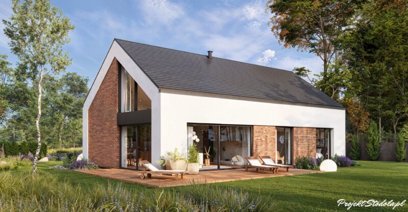 Prosty, parterowy dom typu nowoczesna stodoła zaprojektowany na planie prostokąta i przykryty symetrycznym dachem dwuspadowym o kącie 35°. Taka konstrukcja to ogromna zaleta – dzięki niej budowa jest niezwykle łatwa i przede wszystkim ekonomiczna.