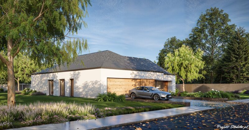 Minimalistyczny i nowoczesny dom parterowy na planie w kształcie litery T, przykryty wielospadowym, symetrycznym dachem o kącie nachylenia 30° (wiodąca kalenica równoległa do drogi dojazdowej). Od strony frontowej budynku zlokalizowano wiatrołap, garderobę,kuchnie oraz garaż z dostępem do pomieszczenia technicznego. Główny ciąg komunikacyjny w kształcie litery L wzdłuż całego budynku łączy poszczególne funkcje. W bezpośrednim kontakcie z częścią ogrodową zaprojektowano salon z jadalnią i kuchnią otwarte  na część wypoczynkową działki. Z tej przestrzeni mamy dostęp do wygodnego zadaszonego tarasu. Przy przejściu do części prywatnej znajduje się pralnia, ogólnodostępna łazienka oraz pokój gościa. Na końcu korytarza komunikacyjnego zaprojektowano dwa pokoje i sypialnię główną z prywatną garderobą i łazienką. Poddasze budynku jest nieużytkowe, pełni funkcję strychu. W korytarzu przewidziano wyłaz na strych.