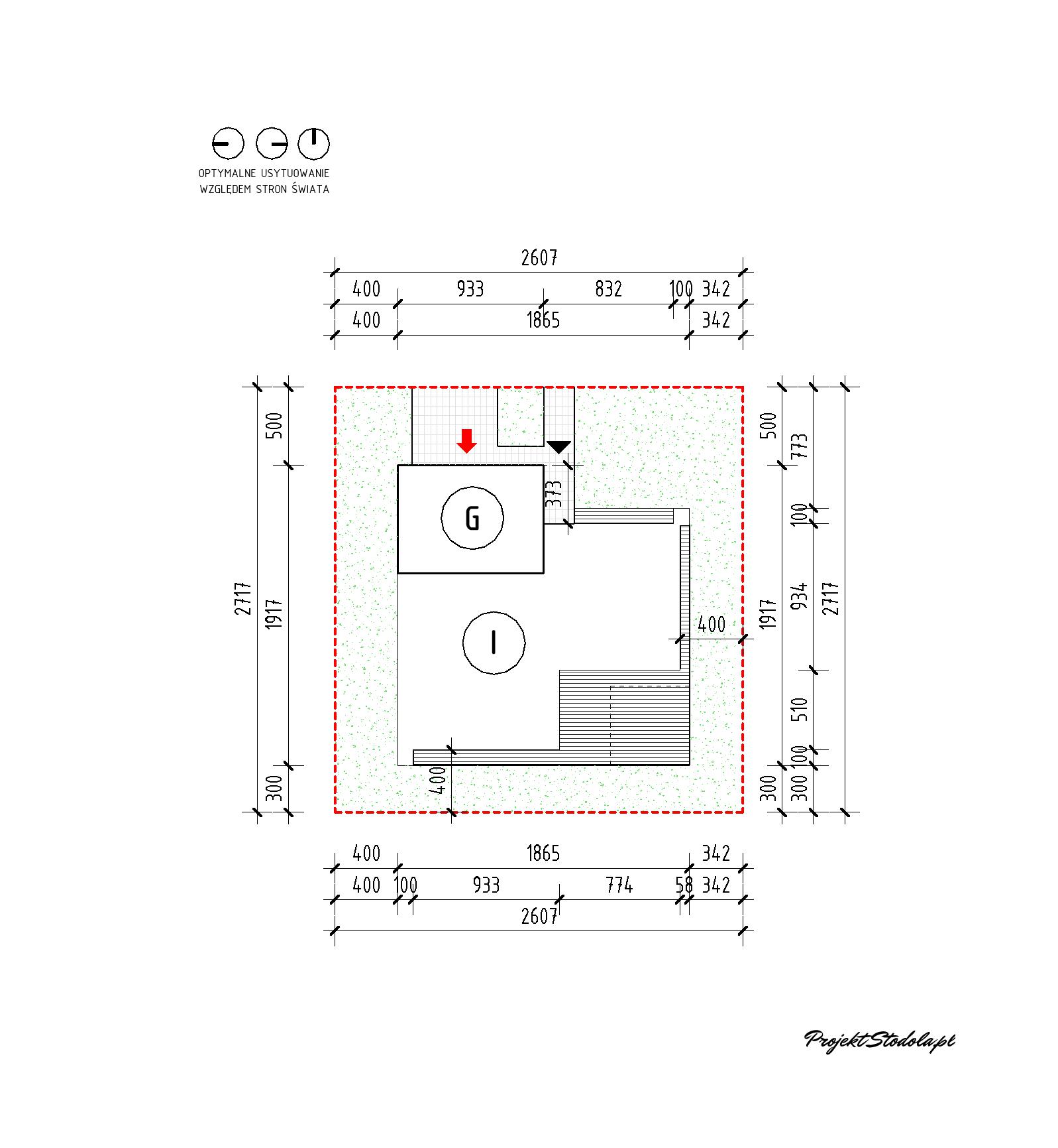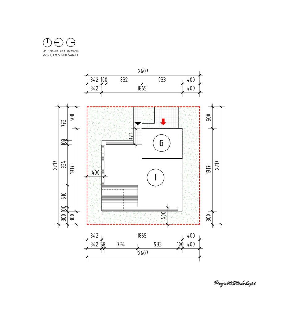 Budynek można usytuować w kilku wariantach. W podstawowym przy wjeździe od preferowanej strony północnej  (Wariant 1) .
