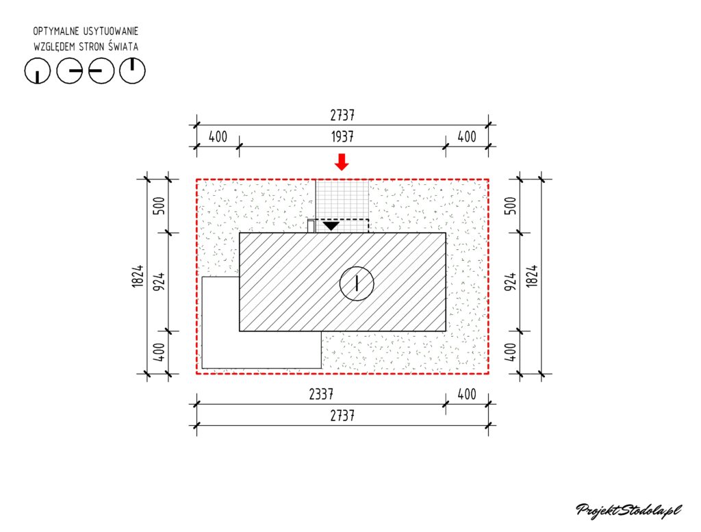 Projekt bazowy dopasowany jest do działek z widokiem od strony tylnej lub bocznej elewacji. Urbanistycznie budynek można dopasować praktycznie do każdej działki, której wymiary pozwalają na jego usytuowanie.