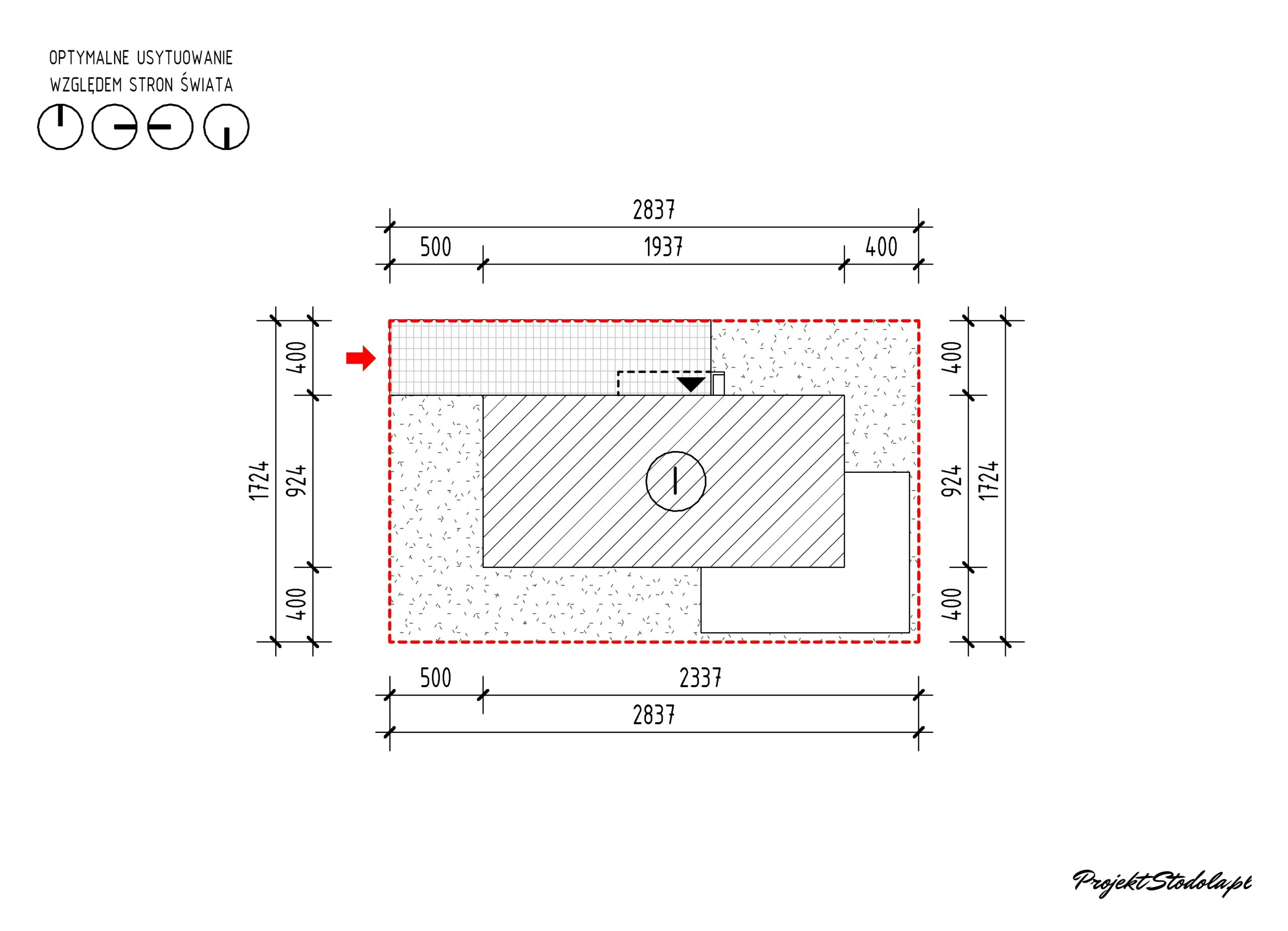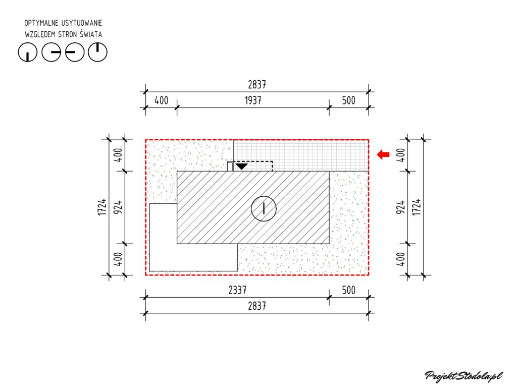 Z uwagi na kompaktowy kształt budynek można usytuować na działce w kilku wariatach.