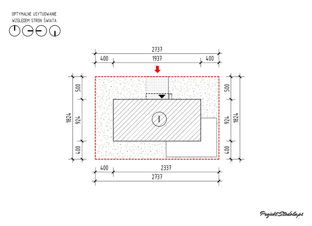 - Wariant 2 – z wjazdem od frontu min. wymiary działki 27,37 x 18,24 m