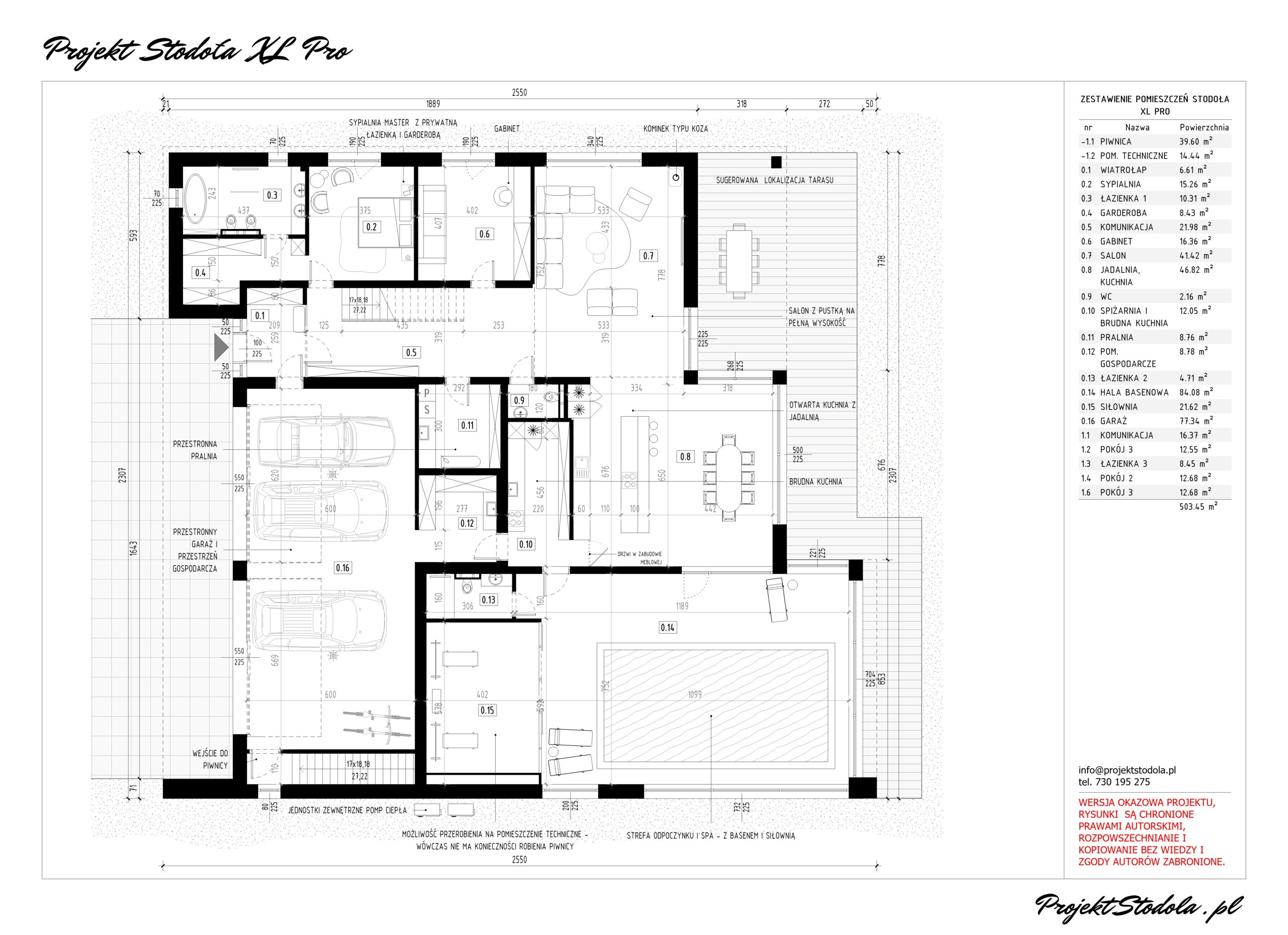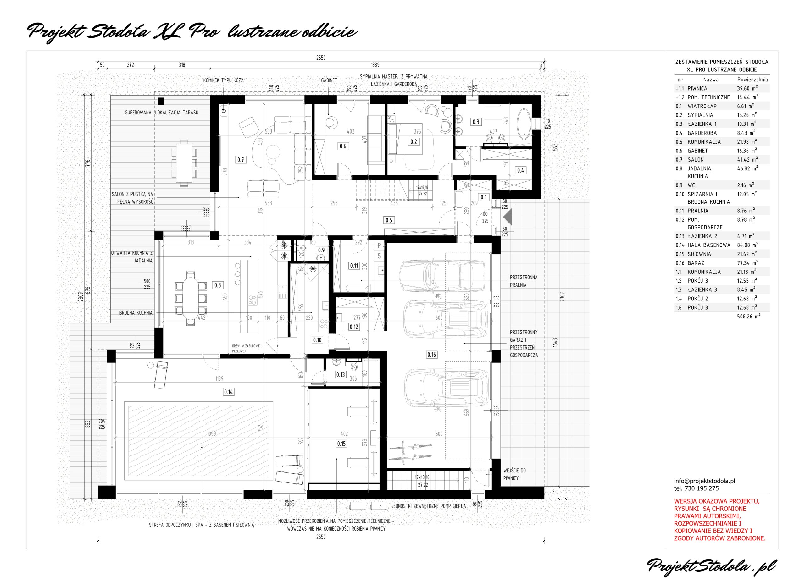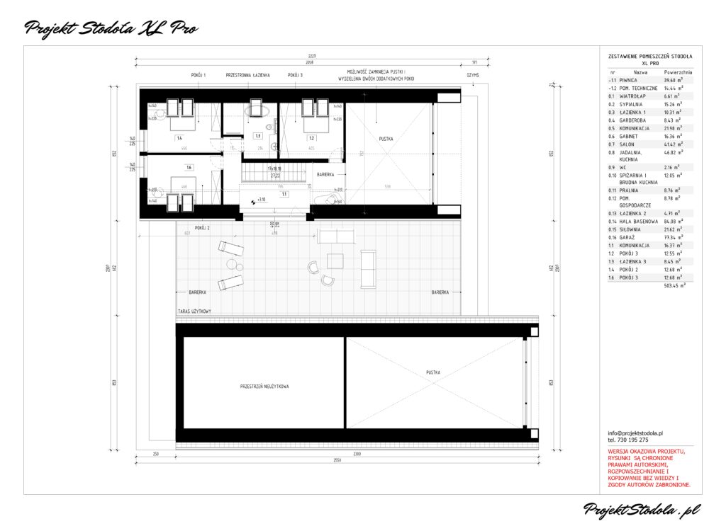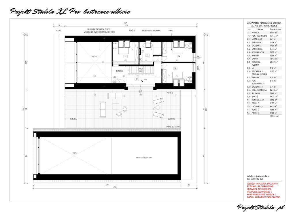 Stodoła XL Pro ma 508.26 m2 powierzchni użytkowej z garażem i piwnicą. Projekt został starannie rozplanowany, aby zapewnić funkcjonalność w podziale na strefy, wygodę, jak i reprezentacyjny efekt. Pomieszczenia dziennego użytku, takie jak jadalnia, salon i kuchnia, zostały umiejscowione od strony ogrodu z dużym przeszkleniem zapewniając harmonijne połączenie z przestrzenią zewnętrzną. Na całej długości tej strefy znajduje się zadaszony taras. Strefa dzienna połączona jest ze strefą rekreacyjną basenem i siłownią. W strefie wejściowej znajduje się wiatrołap, który bezpośrednio łączy się z trzystanowiskowym garażem. Po przejściu z wiatrołapu, znajdujemy się w przestronnej komunikacji, gdzie wyróżniają się eksponowane schody prowadzące na poddasze. Z tej strefy dostępna jest także zlokalizowana na parterze sypialnia master, z łazienką i garderobą oraz dodatkowy pokój pełniący funkcję gabinetu. Komunikacja jest na tyle przestronna, że pozwala na zlokalizowanie zabudowy do przechowywania, znajduje sie tutaj też ogólnodostępny wc. Całość przestrzeni została zaplanowana wzdłuż jednej osi komunikacyjnej, zakończonej dużym salonem z imponującym przeszkleniem, które otwiera widok na działkę i zadaszony taras. Z garażu jestbezpośrednie przejście do domu oraz do piwnicy, która pełni rolę pomieszczenia gospodarczego oraz technicznego. W pomieszczeniu technicznym znajdującym sie w bezpośrednim sąsiedztwie niecki basenowej zaplanowano wszystkie instalacje związane z ogrzewaniem i wentylacją domu oraz basenu.