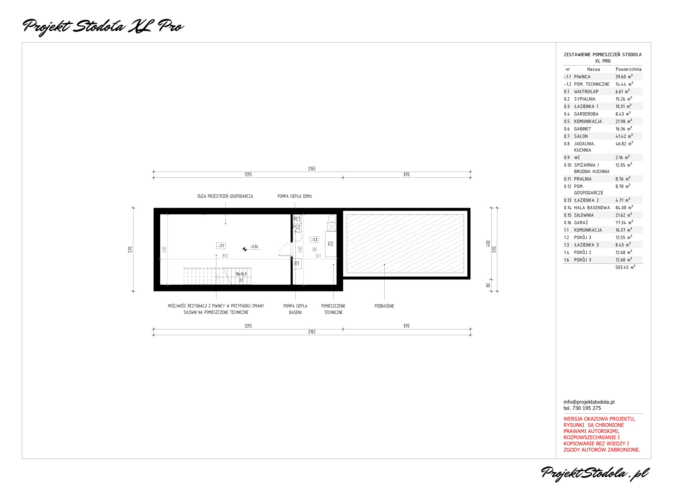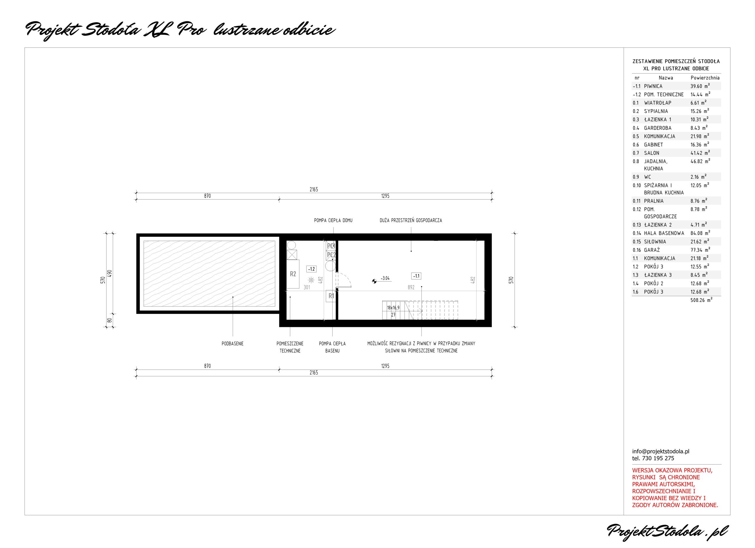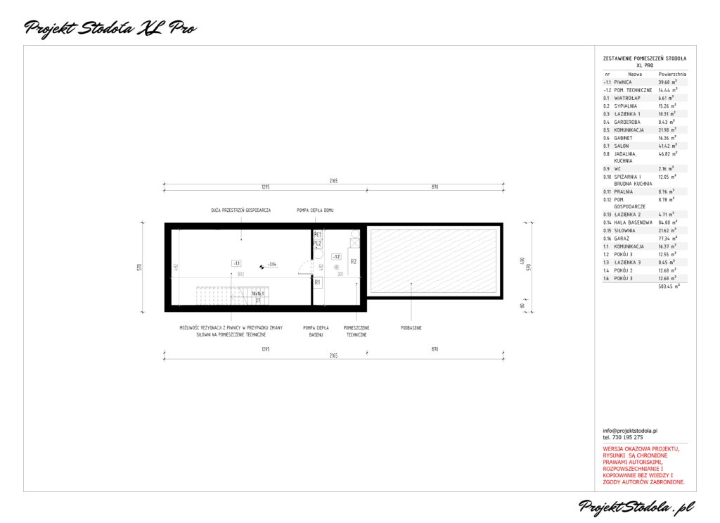 Pod budynkiem na fragmencie znajduje się piwnica będąca częścią gospodarczą, gdzie możemy majsterkować, przechowywać rowery i niezbędne narzędzia do pracy w ogrodzie. W piwnicy znajduje się również pomieszczenie techniczne znajdujące się w bezpośrednim sąsiedztwie niecki basenowej zaplanowano wszystkie instalacje związane z ogrzewaniem i wentylacją domu oraz basenu.