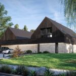 Projekt Stodoła XL Pro – to rozbudowana o część rekreacyjną wersja projektu XL, łącząca funkcjonalność, wygodę i niepowtarzalną estetykę w duchu nowoczesnej stodoły, bez kompromisów z dodatkową przestrzenią na część rekreacyjną z basenem i siłownią. Zachowuje wszystkie cechy niezbędne, aby dom był nie tylko energooszczędny. Budynek charakteryzuje się prostym układem brył, składającym się z dwóch prostokątów przykrytych dwuspadowym dachem z częścią płaską. Elewacja budynku prezentuje się prosto i elegancko, wykorzystując materiały premium takie jak ciemne drewno, jasną ciepła cegłę i blachę, które podkreślają jej charakter premium. Strefa wejściowa jest zadaszona, budynek posiada również zadaszony taras.