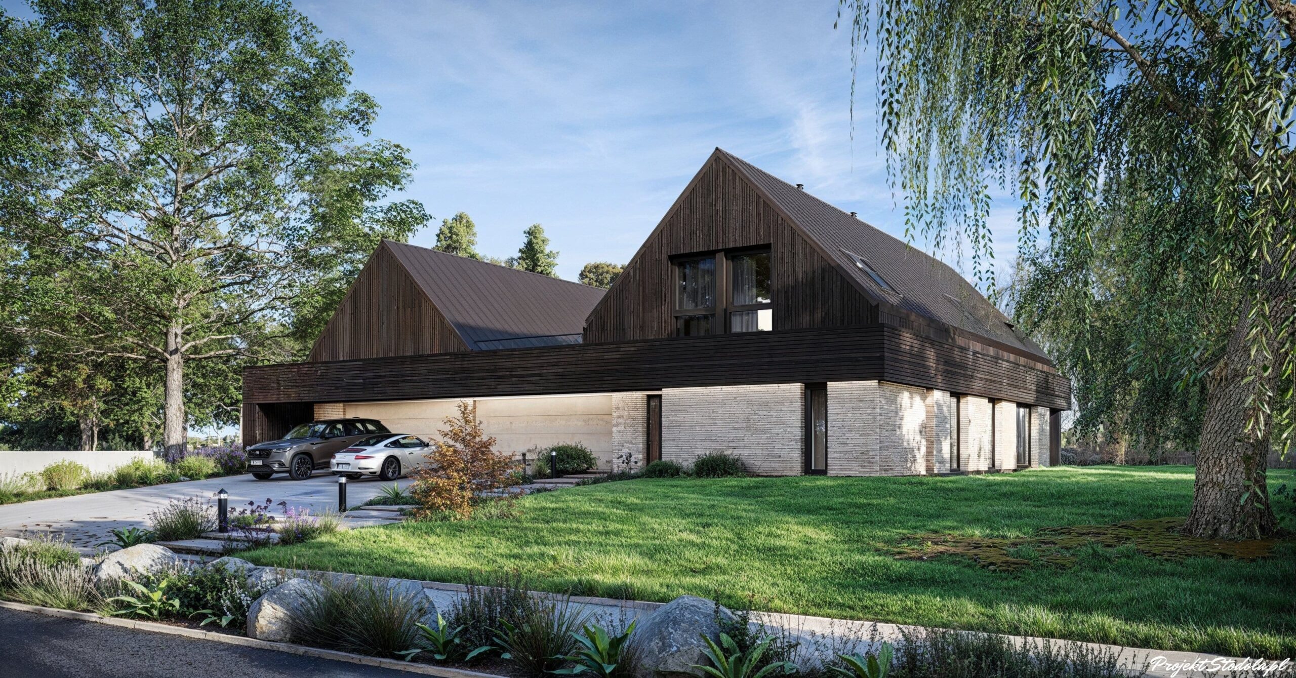 ELEWACJA: ciemna deska drewniana, kremowa cegła, blacha